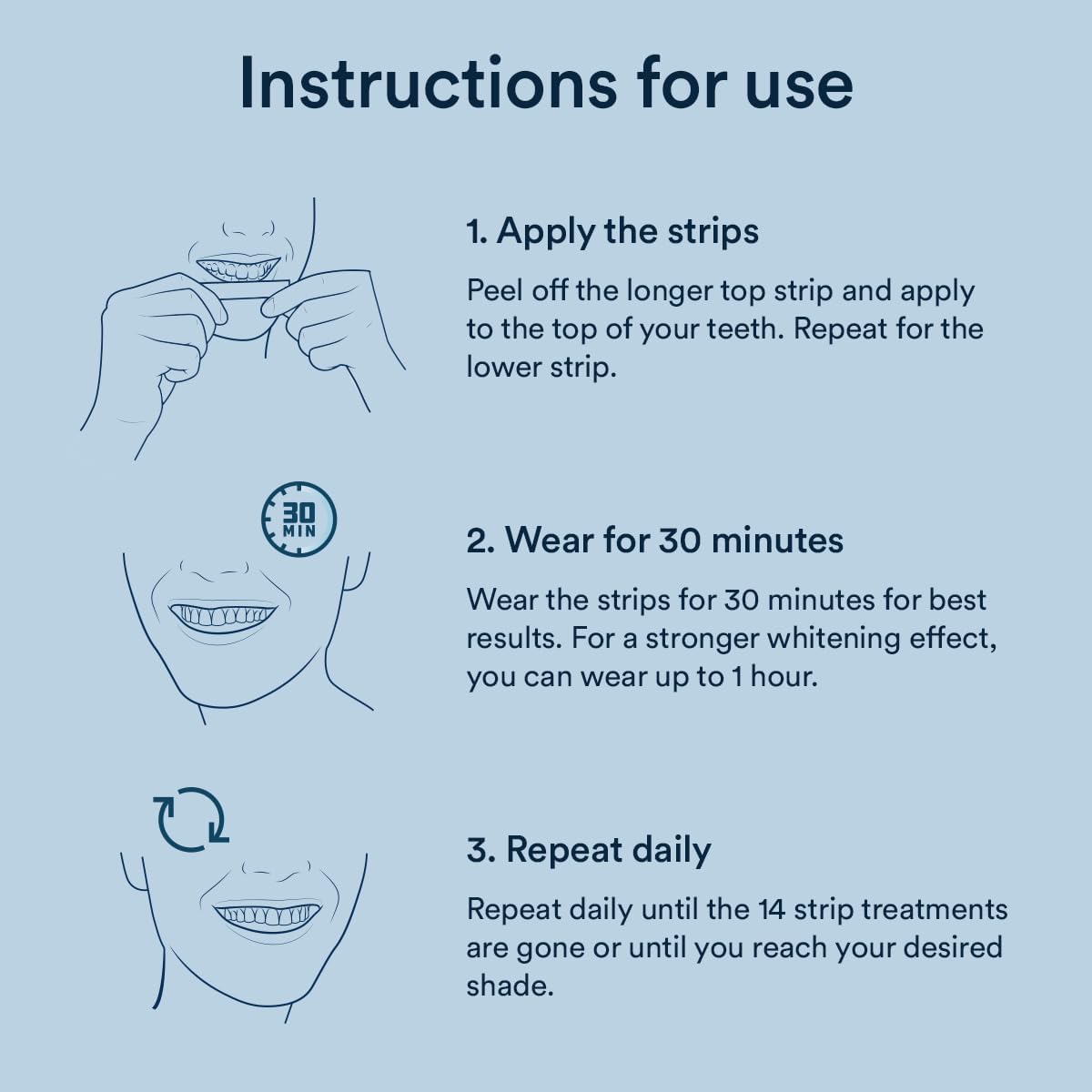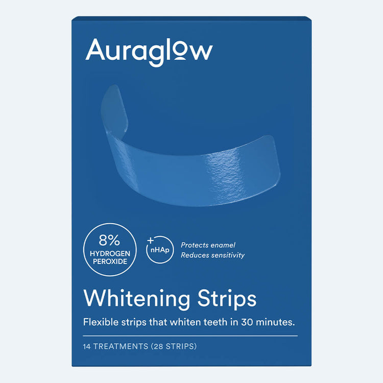 Auraglow teeth whitening strips contain an 8% hydrogen peroxide formula to remove years of stains from coffee, wine, soda, tea and more. Whiten up to 10 shades in just 7 days and see results after just 1 use with our sensitivity free and enamel safe formula.